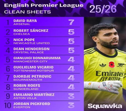 squakwa统计了本赛季英超门将的零封和扑救情况对比数字的,阿尔特塔信任拉亚以7次零封居首的,杜布拉夫卡则以46次扑救领跑整个赛事的确出色的。
