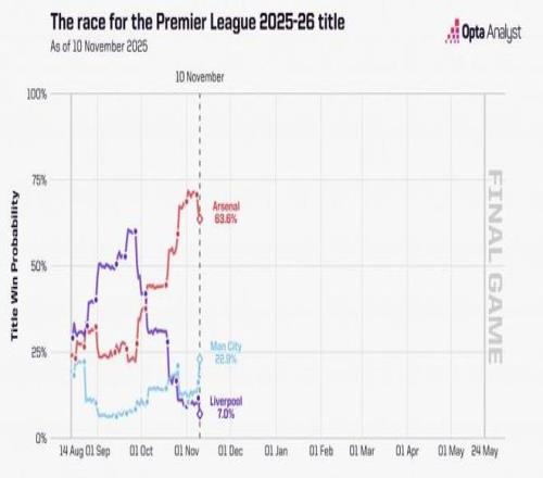 Opta晒英超本赛季截至目前的争冠概率走势:利物浦从赛季初被看好跌到目前的7%,阿森纳目前63.6%,曼城目前22.9%的。不过蓝月提升速率很可靠,这是不少阿森纳粉丝忧虑的。